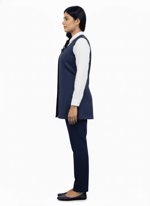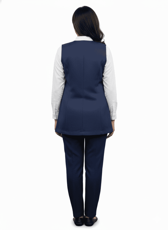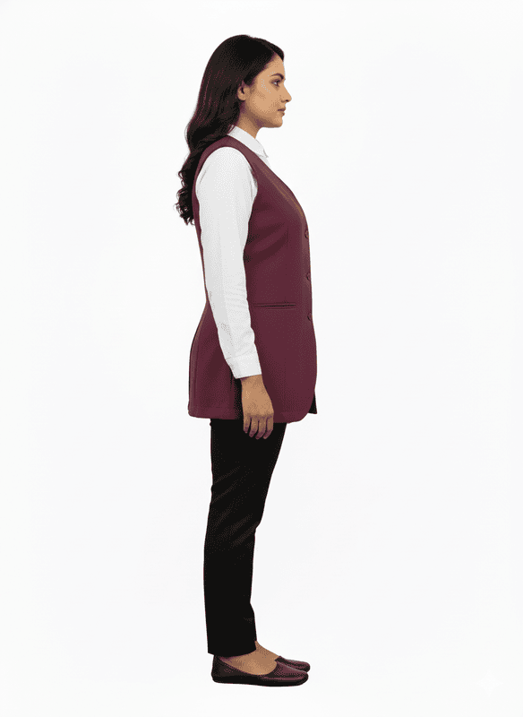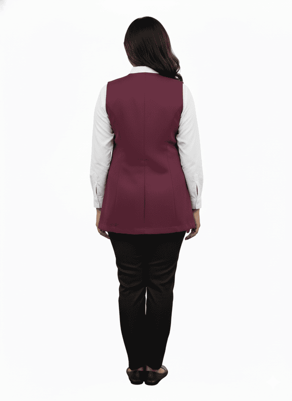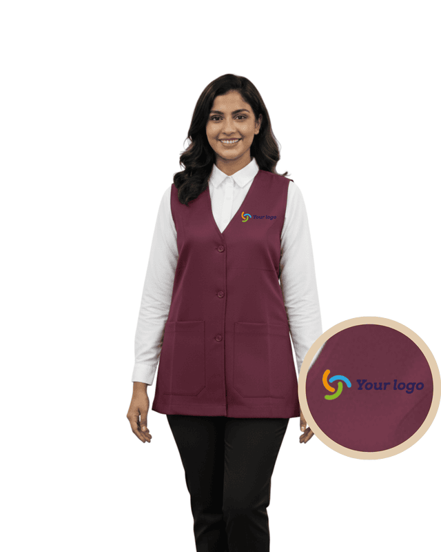“Professional sleeveless coat featuring a clean V-neck design, front buttons, and spacious pockets. Ideal for support staff and housekeeping teams, offering comfort, mobility, and a polished look.”