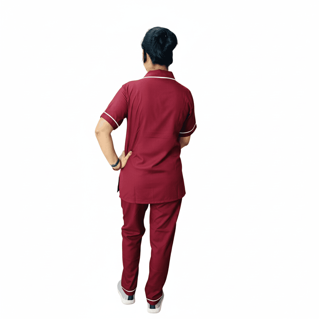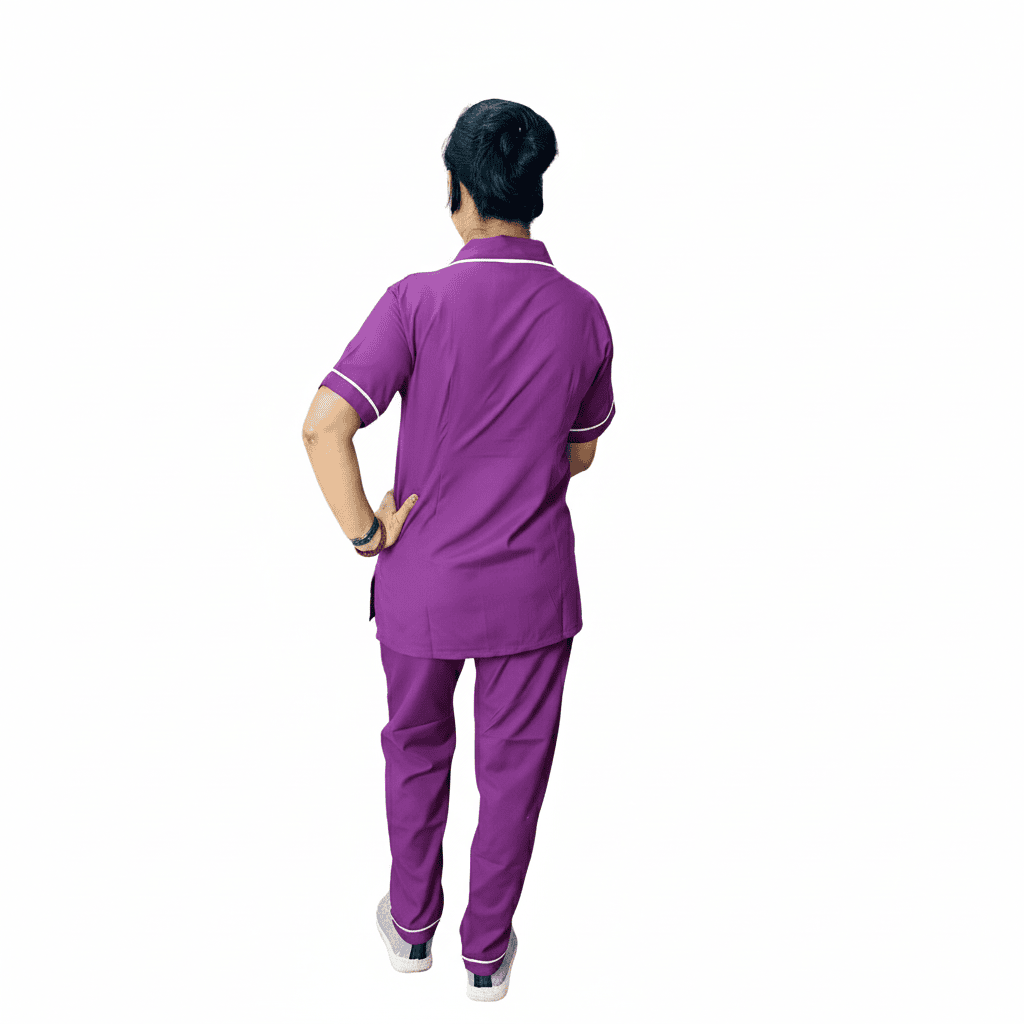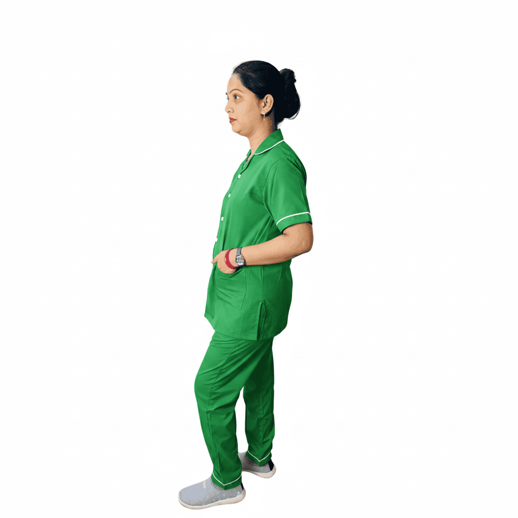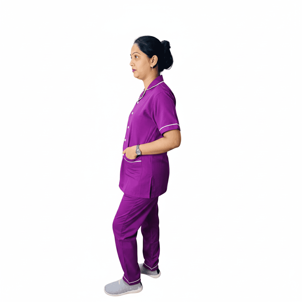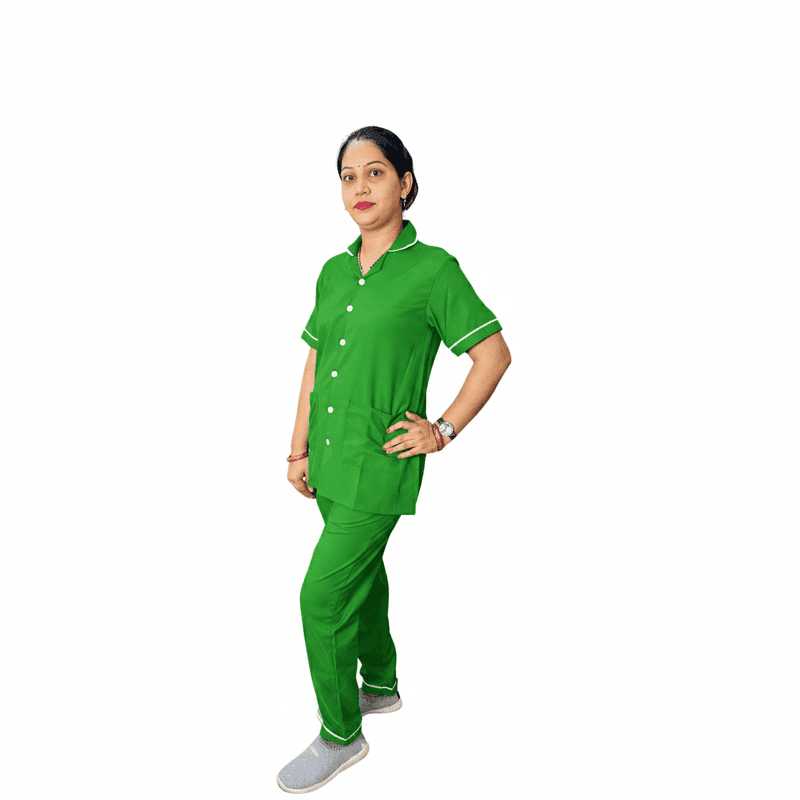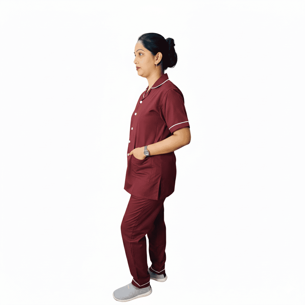 "A professional nurse uniform with a smart stand collar, offering a clean and modern appearance. Designed with comfortable, breathable fabric for all-day ease and durability."