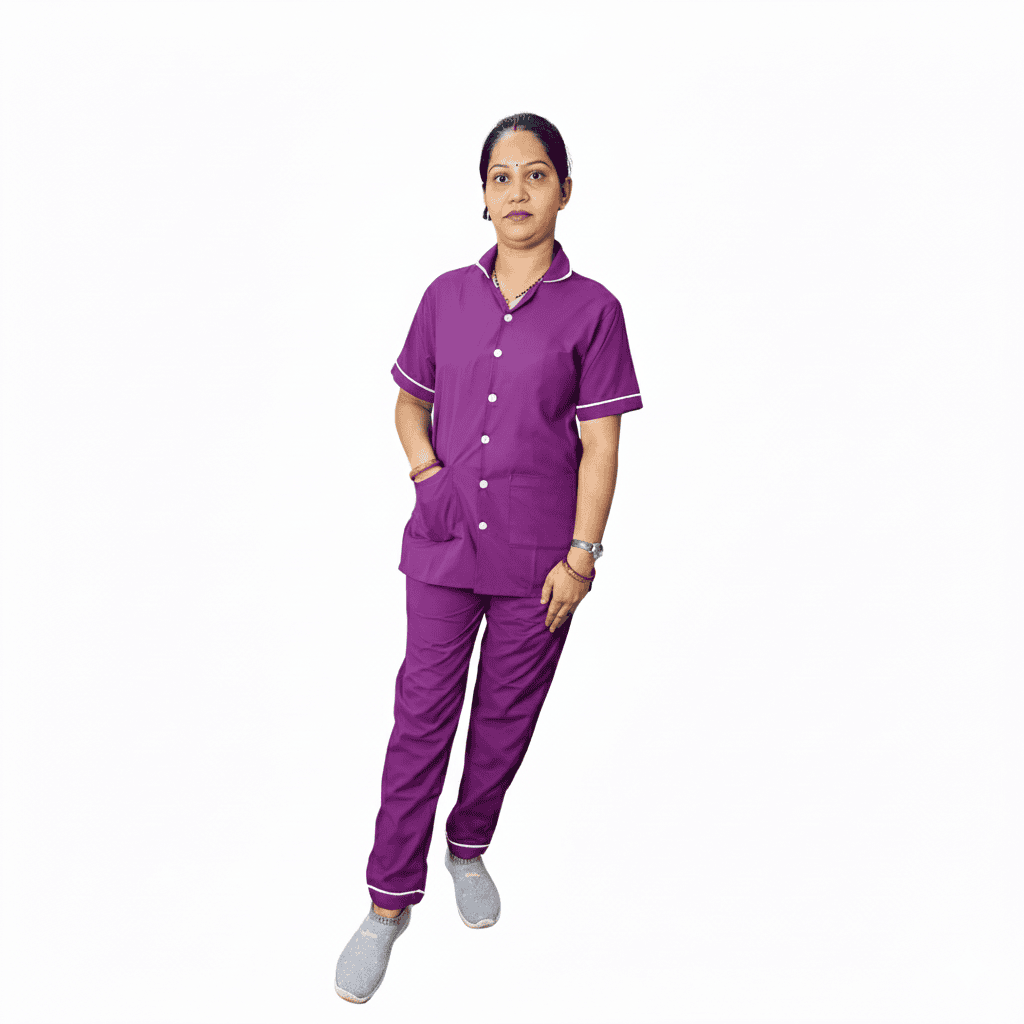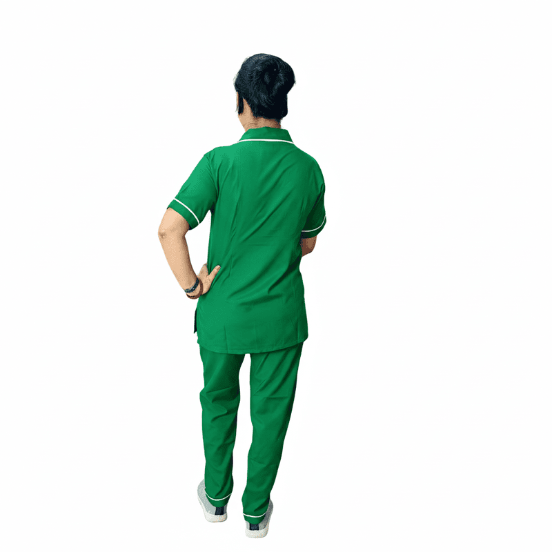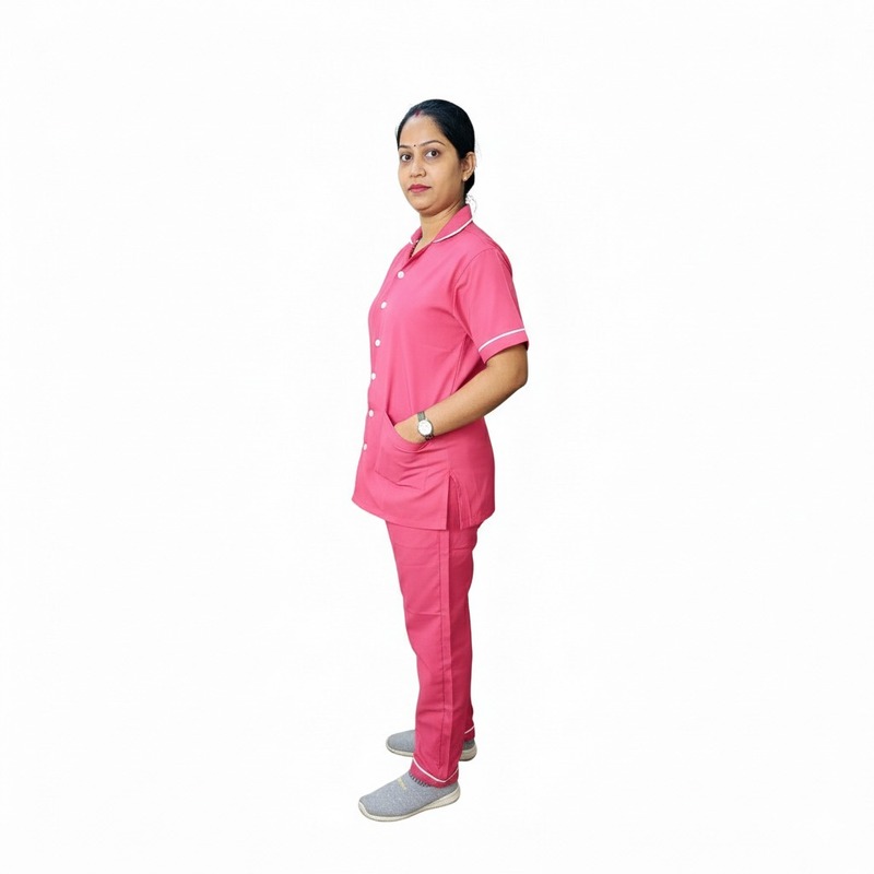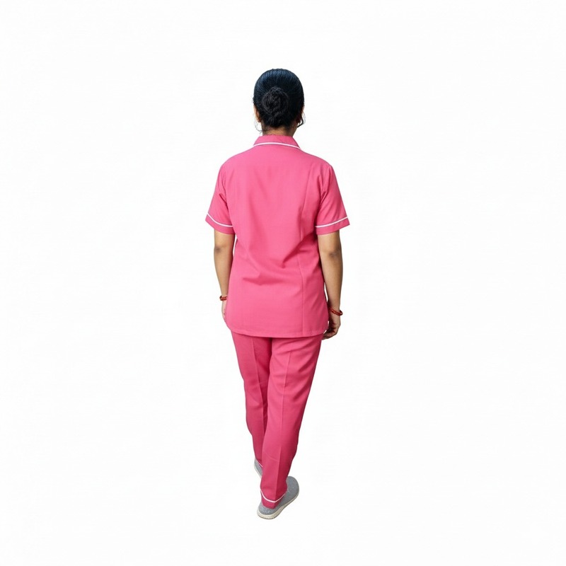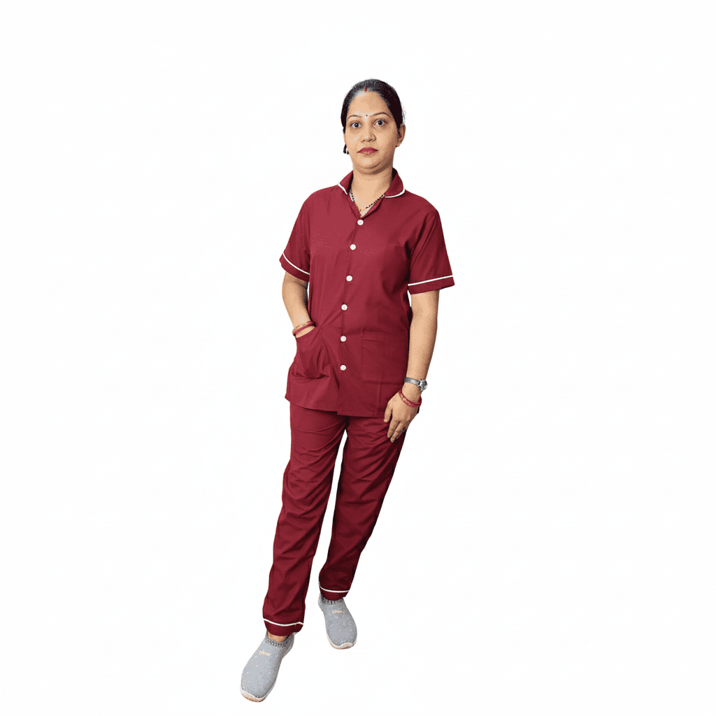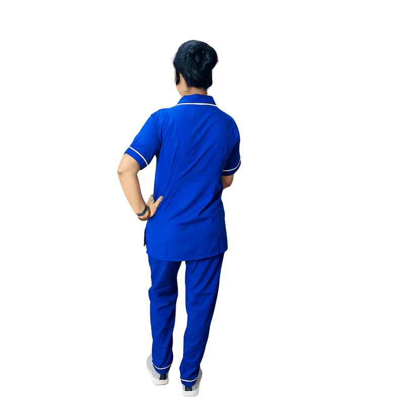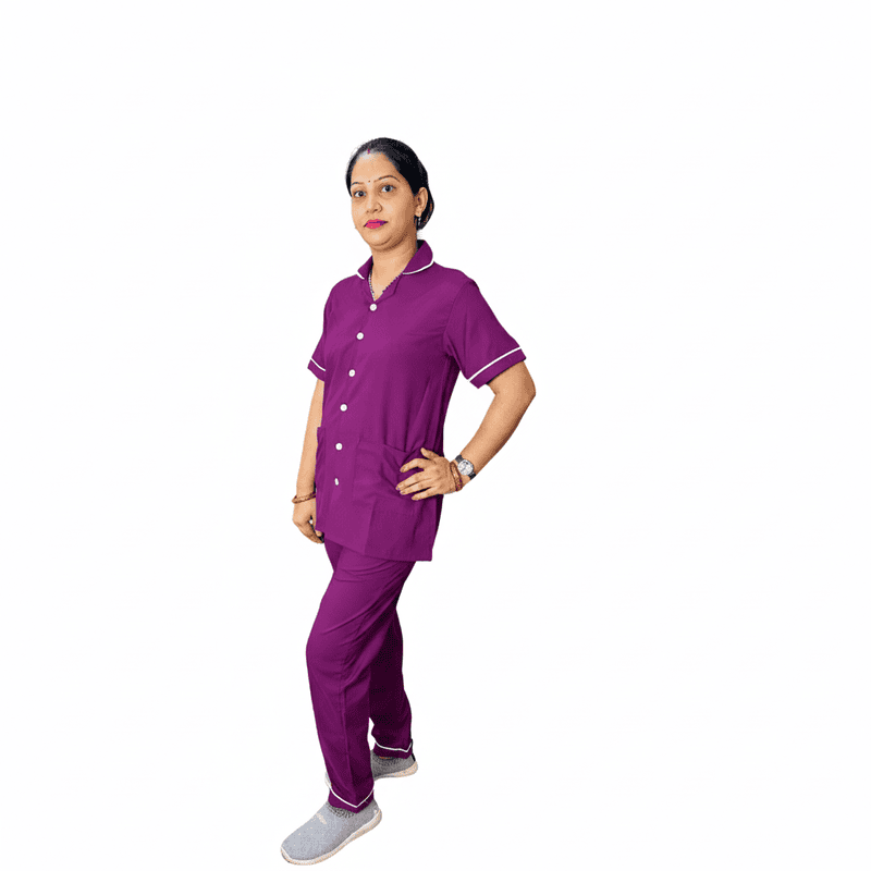 "A professional nurse uniform with a smart stand collar, offering a clean and modern appearance. Designed with comfortable, breathable fabric for all-day ease and durability."
