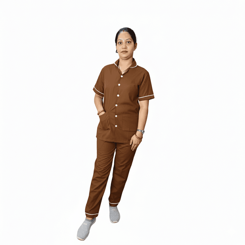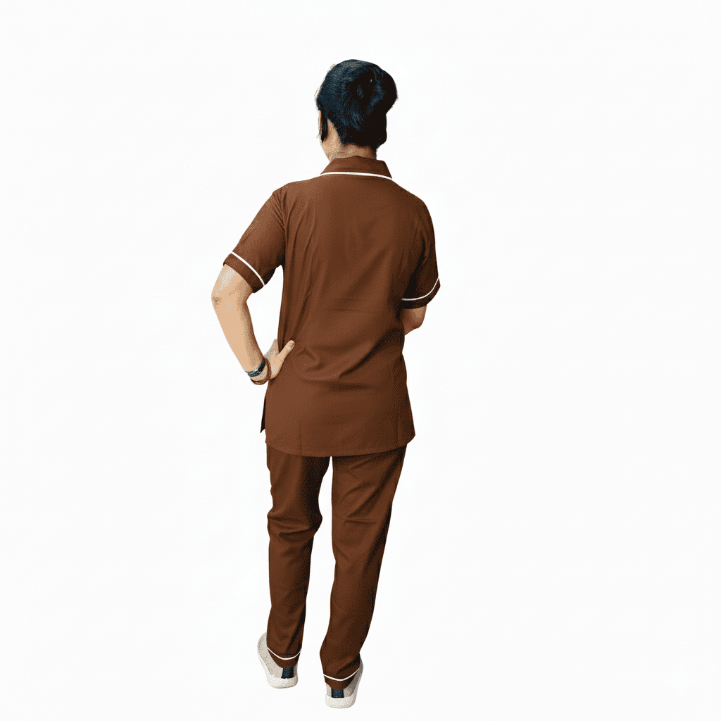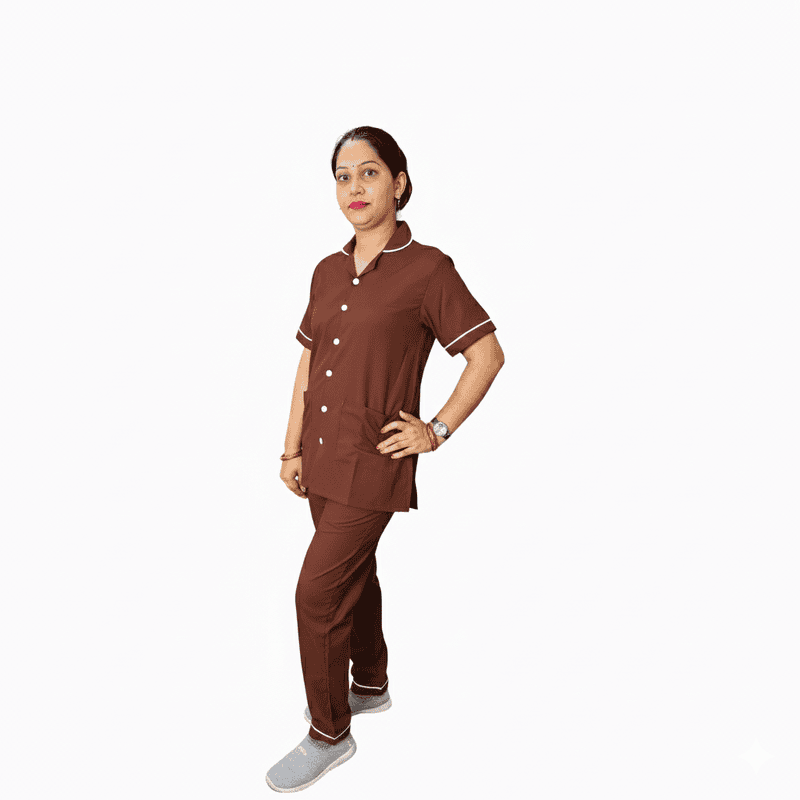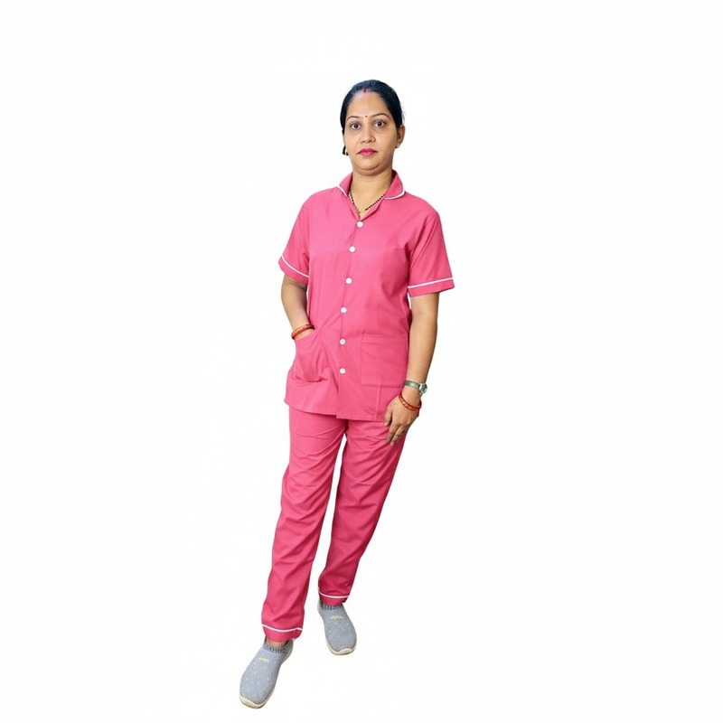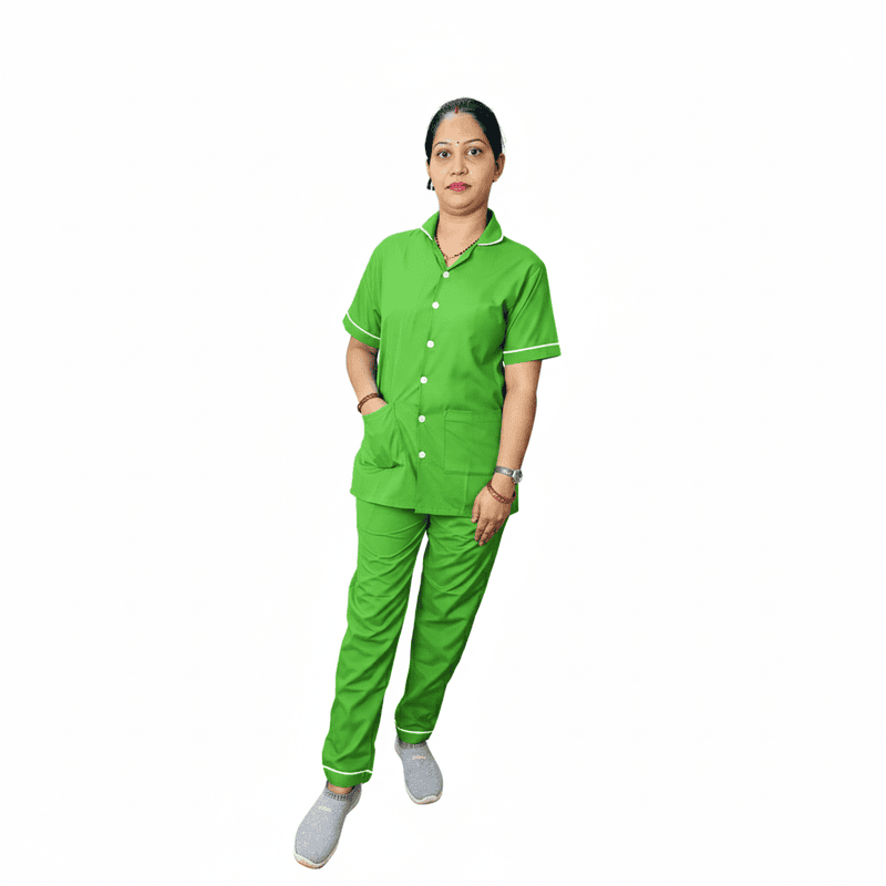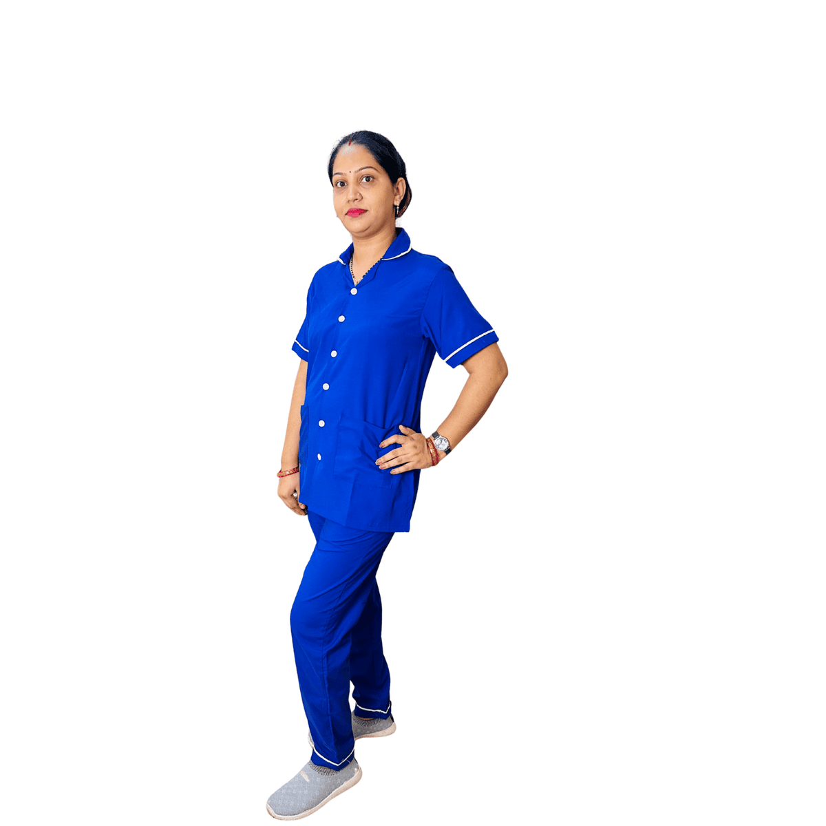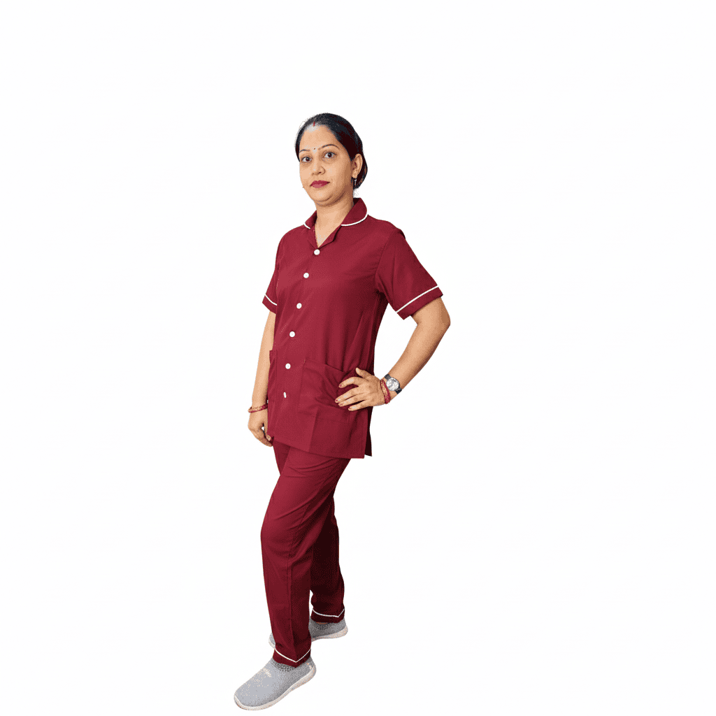 "A professional nurse uniform with a smart stand collar, offering a clean and modern appearance. Designed with comfortable, breathable fabric for all-day ease and durability."