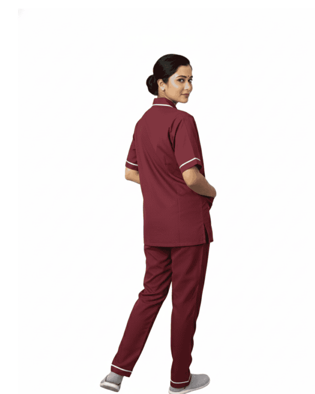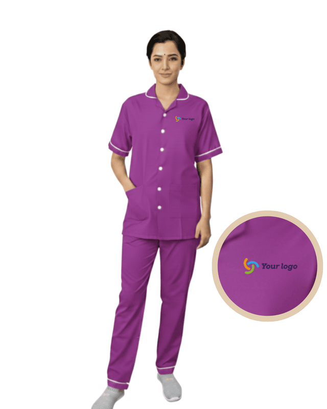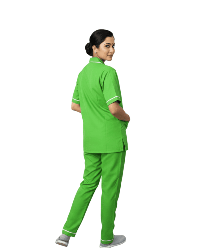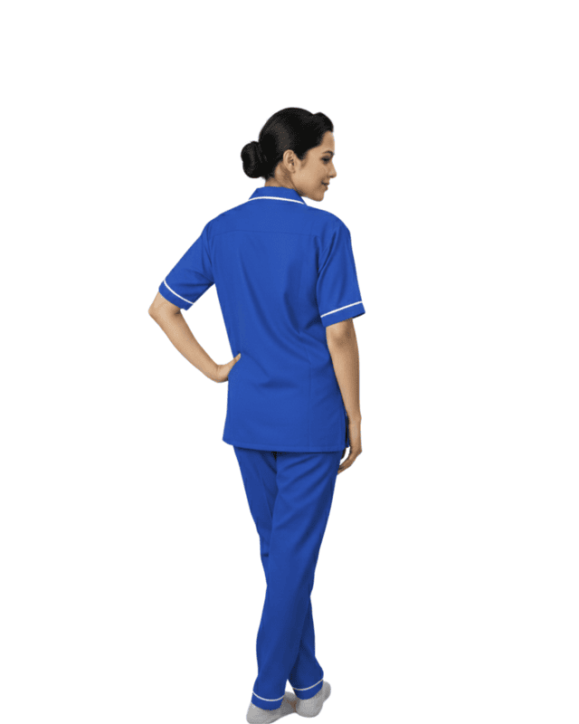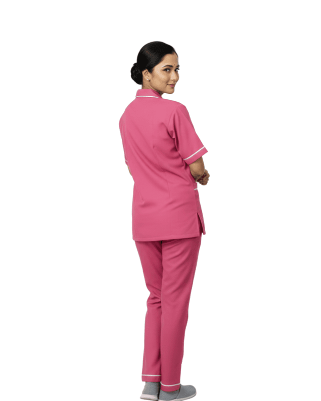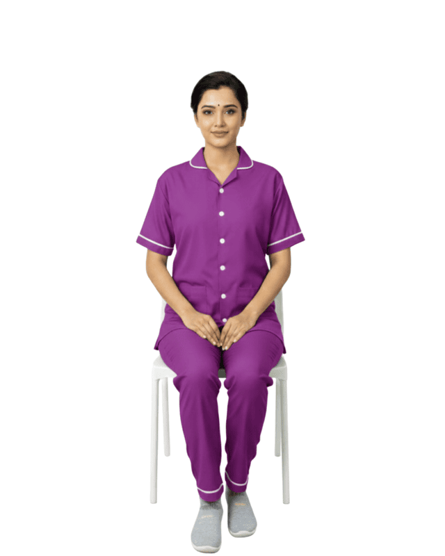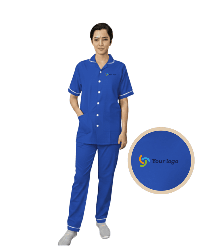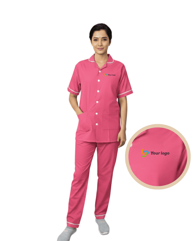 "A professional nurse uniform with a smart round collar, offering a clean and modern appearance. Designed with comfortable, breathable fabric for all-day ease and durability."