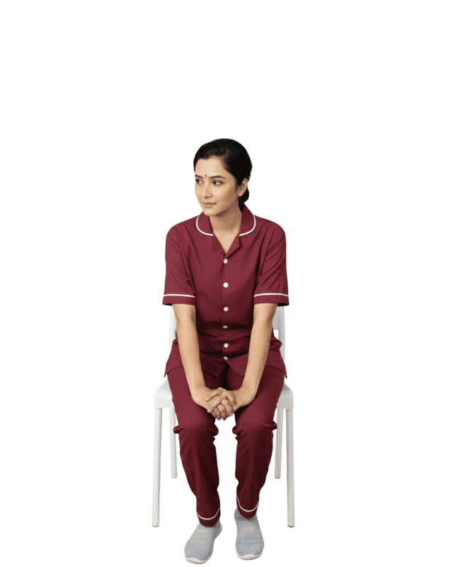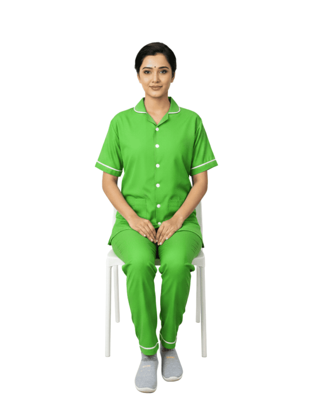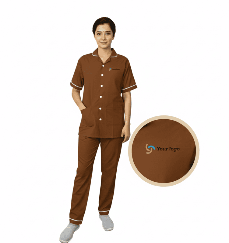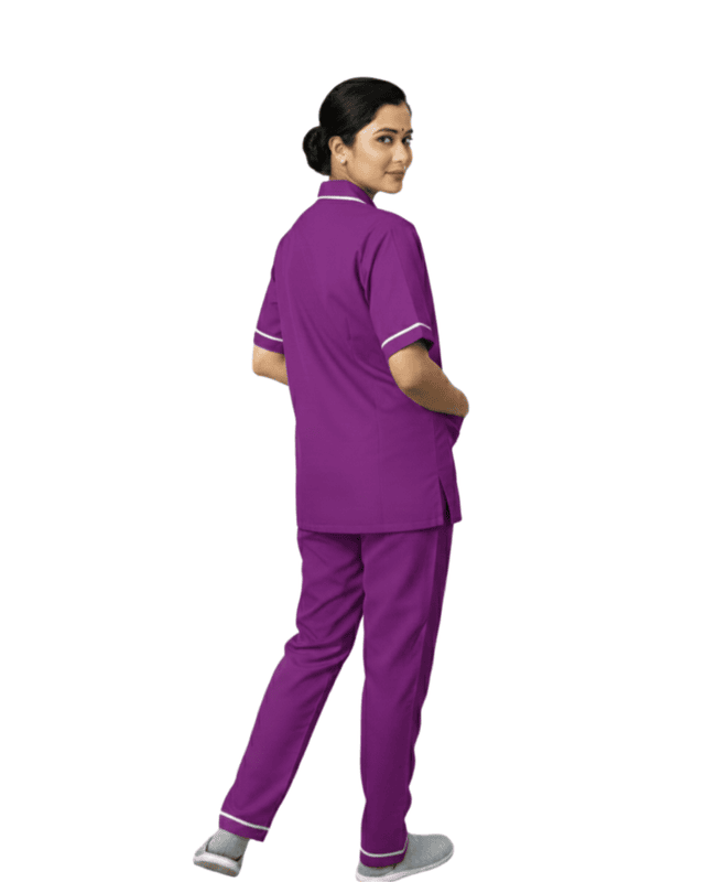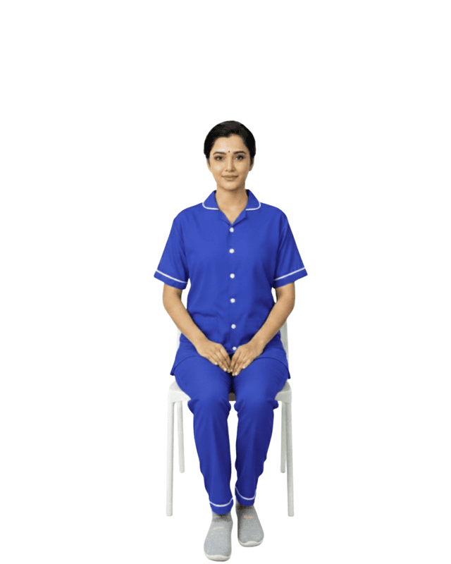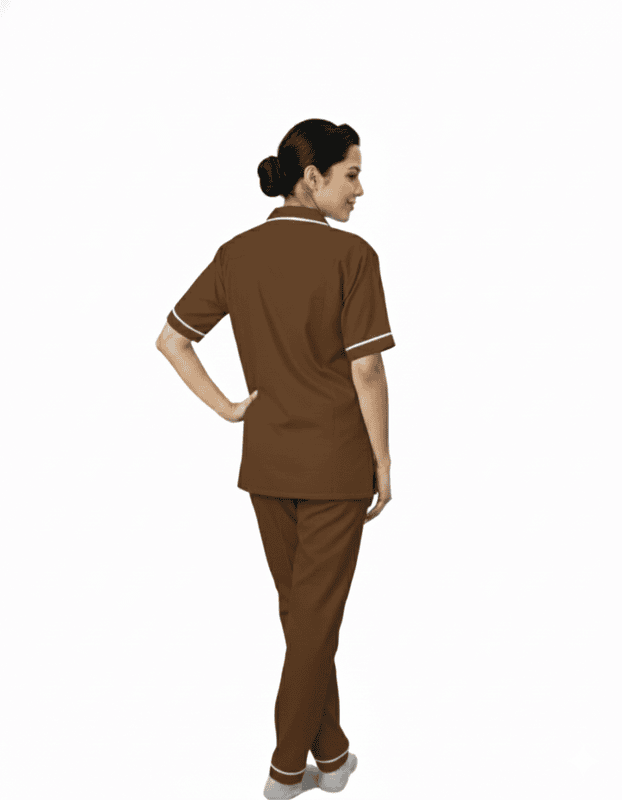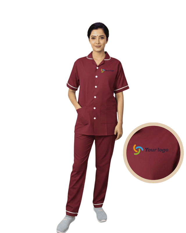 "A professional nurse uniform with a smart round collar, offering a clean and modern appearance. Designed with comfortable, breathable fabric for all-day ease and durability."